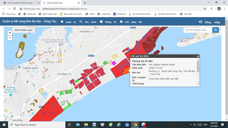 | Từ nay người dân, doanh nghiệp và các sở ngành, địa phương có thể vào trang thông tin điện tử của Sở TN&MT tại địa chỉ http://www.sotnmt.baria-vungtau.gov.vn để tra cứu các thửa đất công. Tại mỗi thửa đất đều có thông tin về vị trí, số tờ, số thửa, diện tích, quy hoạch, đơn vị nào đang quản lý đất. |