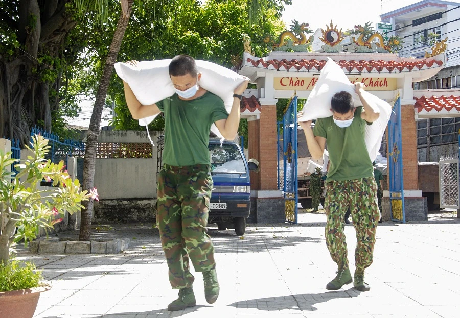 Các chiến sĩ trung đoàn 88, Sư đoàn 302, Bộ Tư lệnh quân khu 7 hỗ trợ vận chuyển gạo tại TP Vũng Tàu-Ảnh:MT