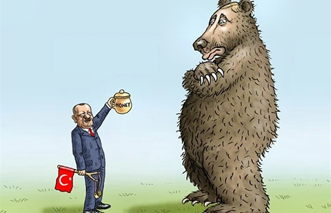 Tổng thống Thổ Nhĩ Kỳ vừa xoa dịu Nga vừa sẵn sàng bắn rơi máy bay Nga. Biếm họa của MARIAN KEMENSKY (Slovakia)