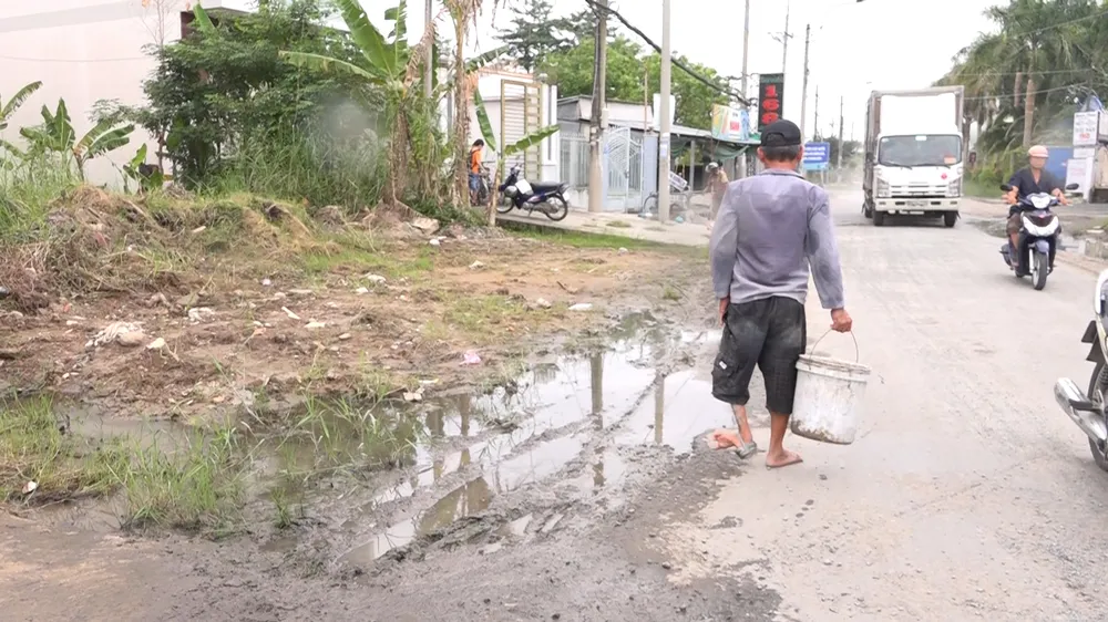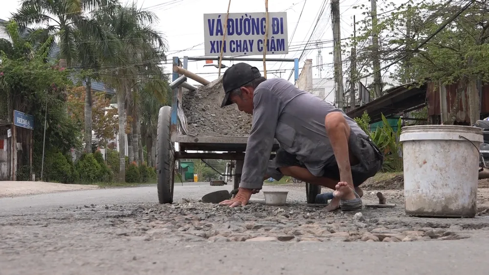 Dù chân đi lại khó khăn nhưng ông Ba Dân quân không quản cực nhọc đi vá từng ổ voi, ổ gà trên đường.