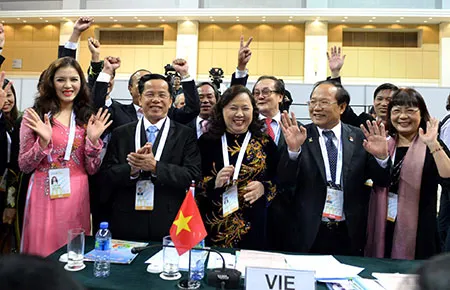 Niềm vui của các thành viên ở Ủy ban Olympic Việt Nam và Bộ VH-TT&DL khi giành quyền đăng cai ASIAD 18-2019. Ảnh: QUANG THẮNG