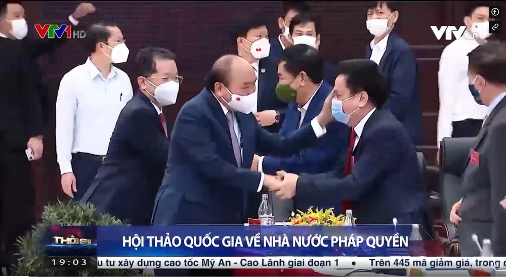 Chủ tịch nước Nguyễn Xuân Phúc cùng các đồng chí lãnh đạo Đảng và Nhà nước chủ trì hội thảo. Ảnh: Thống Nhất/TTXVN