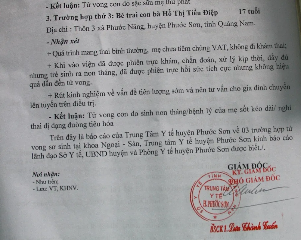 Báo cáo nêu cụ thể, trường hợp thứ nhất là con của sản phụ Hồ Thị Phơ (17 tuổi, trú thôn Trà Văn A, xã Phước Kim, huyện Phước Sơn). Sản phụ Phơ nhập viện lúc 10 giờ 20 ngày 4-9 và được chẩn đoán thai con so đủ tháng chuyển dạ, tăng huyết áp, bệnh kèm không có, biến chứng chưa.