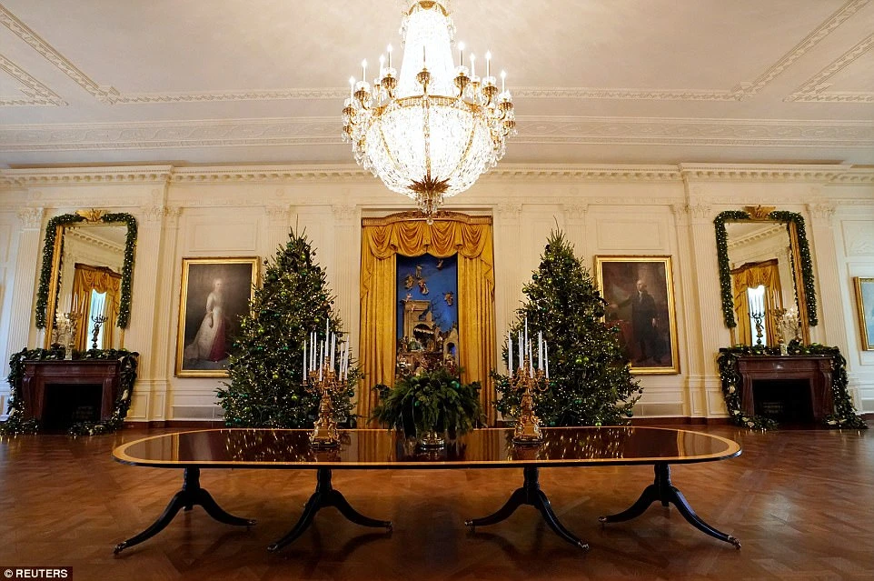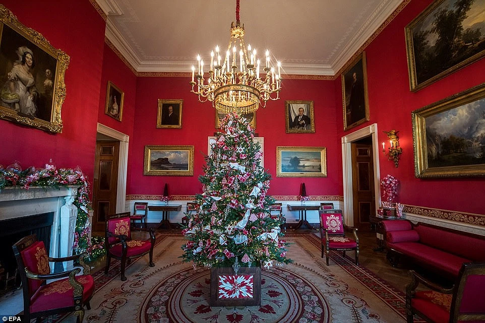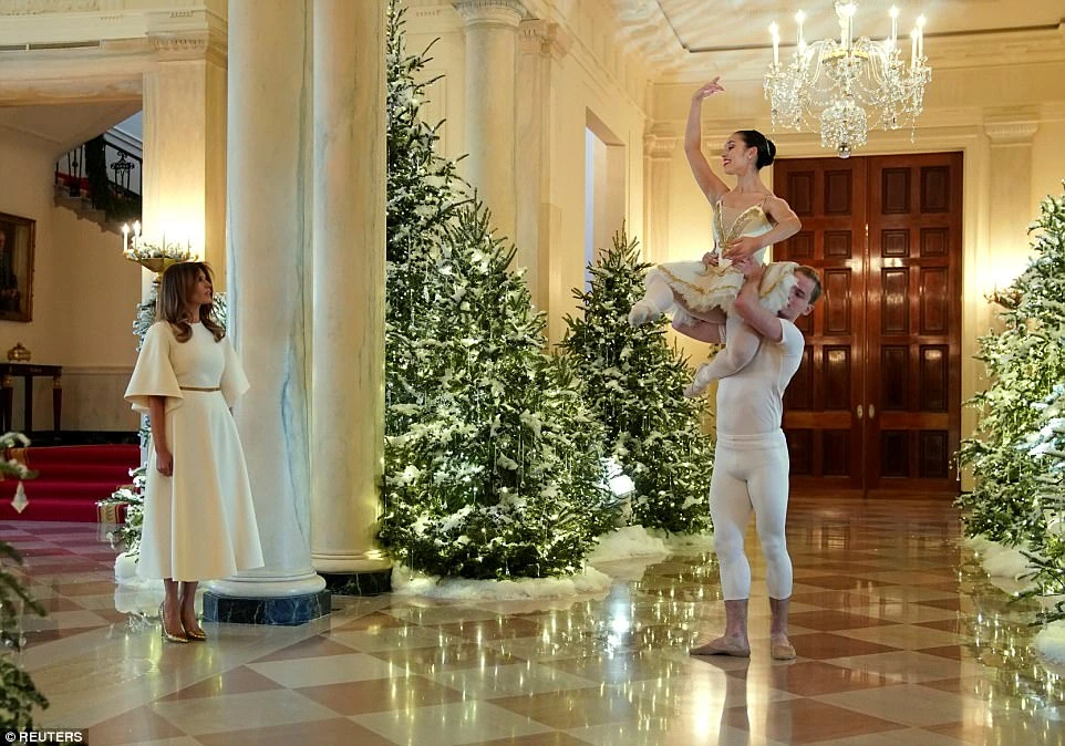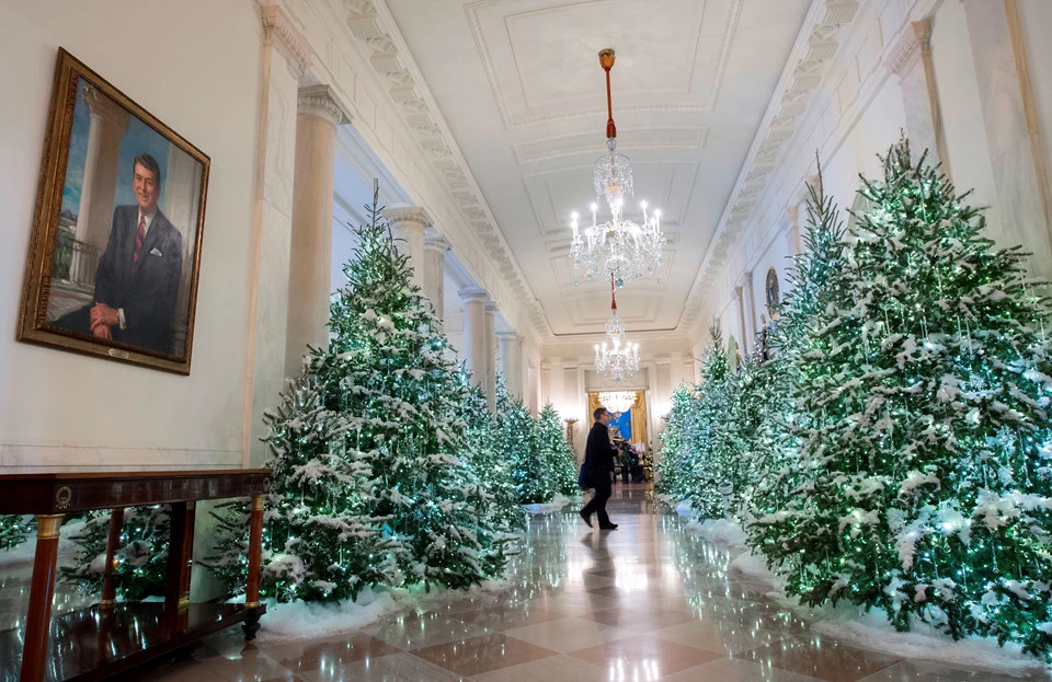 Từng ngóc ngách của Nhà Trắng giờ đã rực rỡ sắc màu Giáng sinh. Những cây thông được trang trí lung linh với những vật trang trí thích mắt. Tiếng nhạc chào đón ngày lễ lớn réo rắt từng căn phòng. Thêm vào đó là đôi vũ công uyển chuyển giữa những giai điệu tạo nên một bức tranh tổng thể tuyệt đẹp.