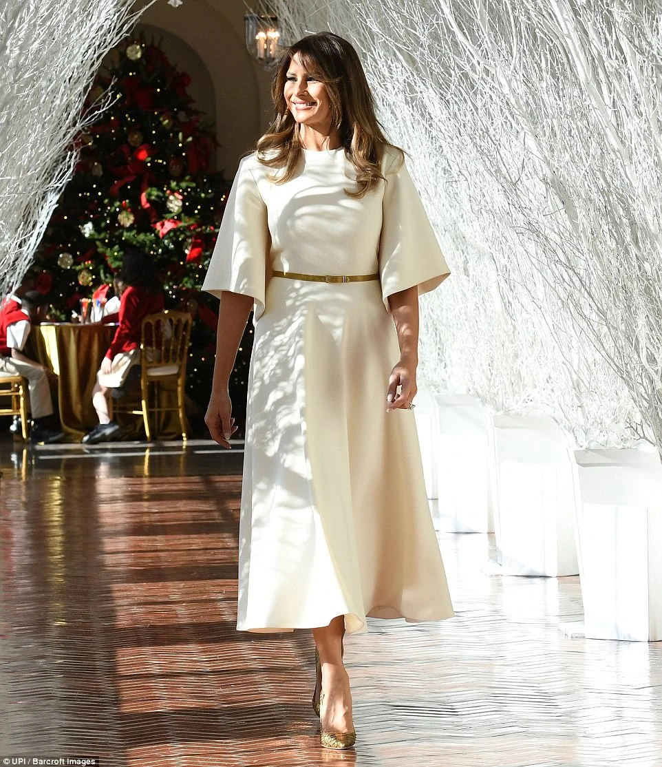 Tại căn phòng phía Đông ấm cúng, bà Melania nhẹ nhàng chào hỏi các em bé, những vị khách đặc biệt đầu tiên trong mùa Giáng sinh năm nay, Giáng sinh đầu tiên của gia đình Tổng thống Trump tại Nhà Trắng.