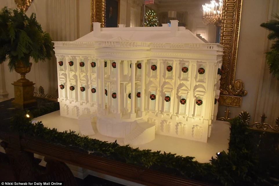 Nhà bánh gừng mô phỏng nhà trắng được tỉ mỉ gắn từng chiếc vòng nguyệt quế xinh xắn. Ảnh: Daily Mail