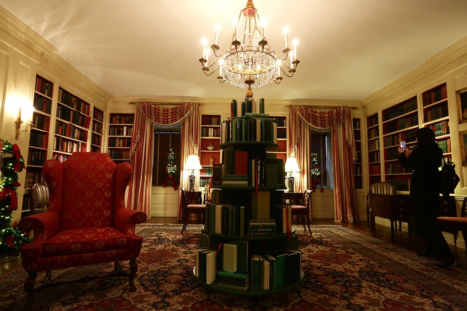 Một cây thông bằng sách nằm giữa phòng thư viện của Nhà Trắng. Ảnh: AP