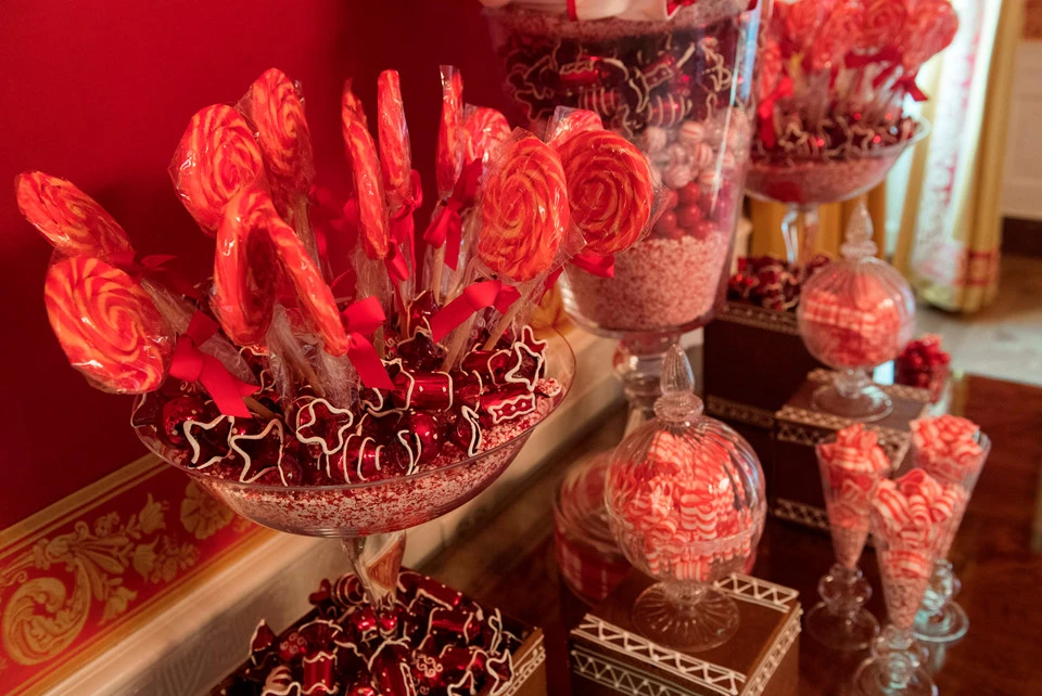 Phòng đỏ được bà chọn tông chủ đạo cùng tên với căn phòng. Điểm nhấn chủ đạo là cây thông xinh xắn được gắn nhiều chiếc nơ đỏ truyền thống của Giáng sinh. Bên cạnh đó, một bàn kẹo bánh do chính những đầu bếp trứ danh của Nhà Trắng làm ra và được bà Melania tỉ mỉ trang trí.