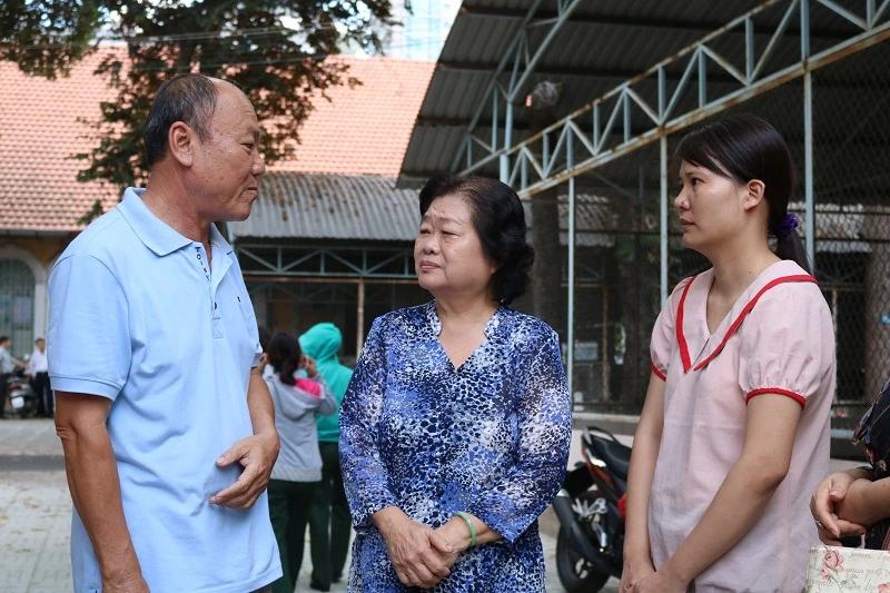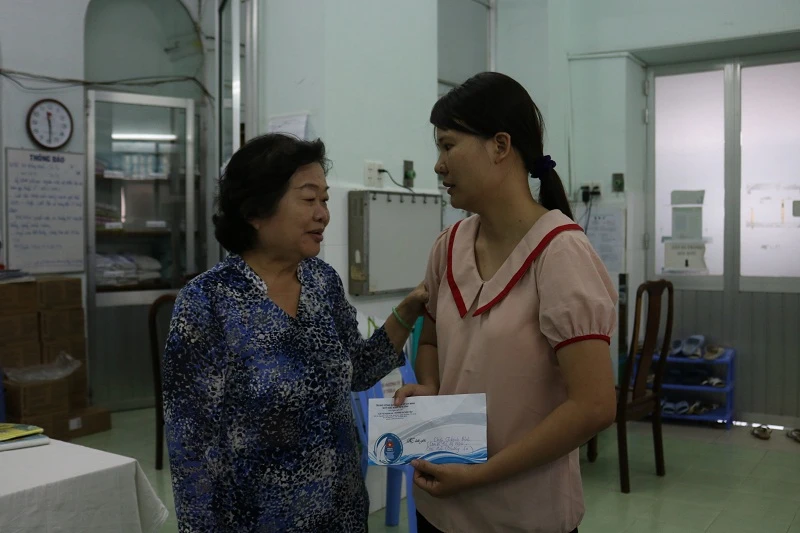 Bà Trương Mỹ Hoa động viên chị Thủy là mẹ của bé Thanh Bình cố gắng để chăm lo cho bé. ẢNH: THANH TUYỀN.