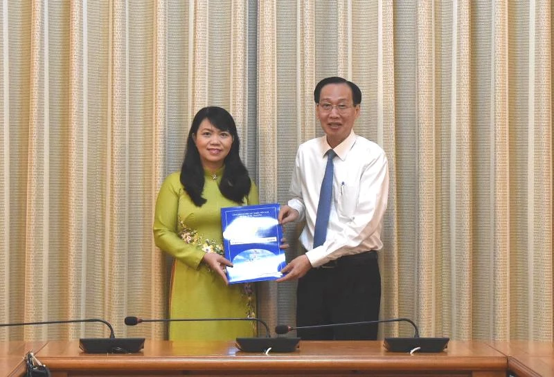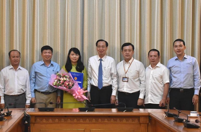 Phó Chủ tịch Thường trực UBND TP.HCM Lê Thanh Liêm trao quyết định cho bà Vũ Thị Huỳnh Mai. Ảnh: PHƯƠNG THÙY