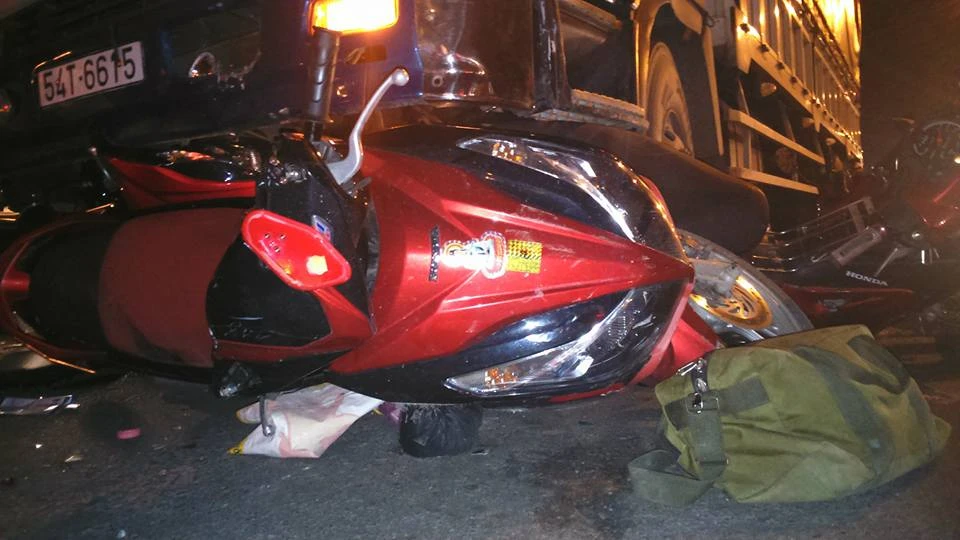 Theo quan sát tại hiện trường thì ba chiếc xe máy bị cuốn vào gầm xe tải, một chiếc bị húc văng qua một biên.
