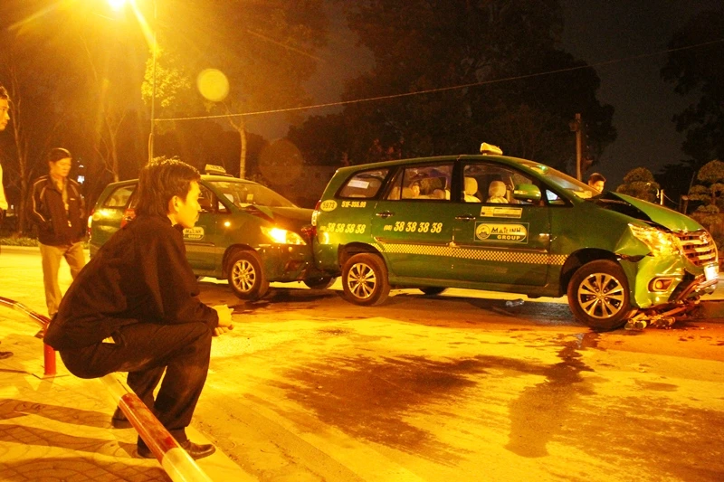 Cú tông mạnh đã đẩy chiếc xe taxi này lùi lại, đúng lúc một xe taxi khác đang trờ tới tạo thành chuỗi va chạm liên hoàn giữa ba phương tiện.