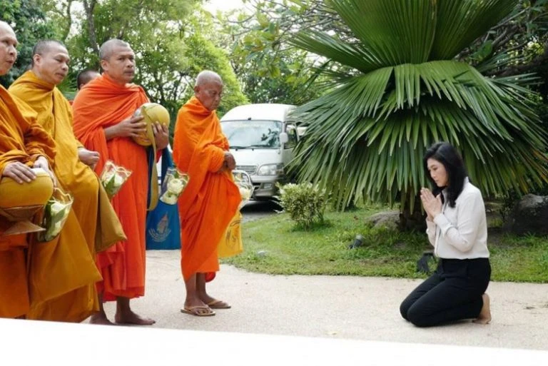 Bà Yingluck được nhìn thấy quỳ gối trước các nhà sư. Ảnh: Chiangrai Times