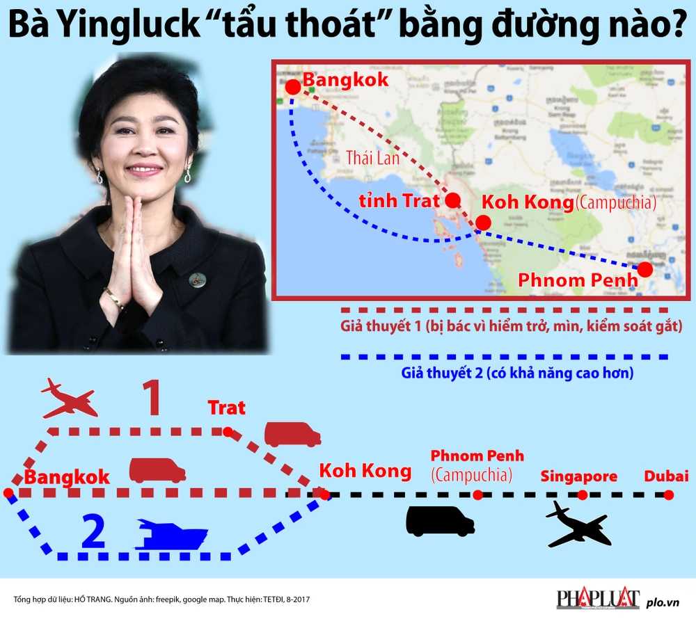 (PLO)- Có hai giả thuyết được đưa ra, phương án 1: Cựu Thủ tướng Yingluck Shinawatra dùng thuyền cao tốc đi từ vùng Rayong đến một trong các đảo Koh Chang, Koh Kood hoặc Koh Laoya của Trat, sau đó sang Campuchia và bay đến Dubai. Phương án 2: Bà Yingluck đi máy bay riêng đến sân bay ở tỉnh Trat (cực Đông Thái Lan) rồi vượt biên giới đường bộ, di chuyển qua tỉnh Koh Kong (Campuchia) và tìm cách bay đến Singapore và đến Dubai.