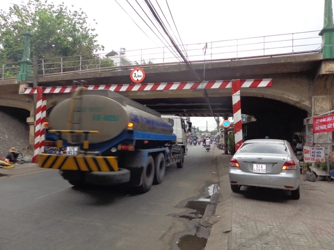 Xe tải chở bồn nước hơn 12 m3 cung cấp thường xuyên cho quận 8 vẫn qua lại bình thường dưới dạ cầu Phạm Thế Hiển.