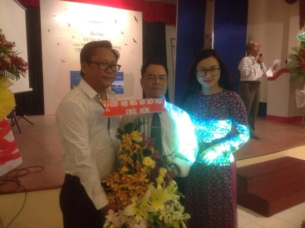 Nhà thơ Phùng Hiệu và nhà thơ Phạm Phương Lan thay mặt Chi hội Nhà văn Bến Nghé tặng hoa cho tác giả.