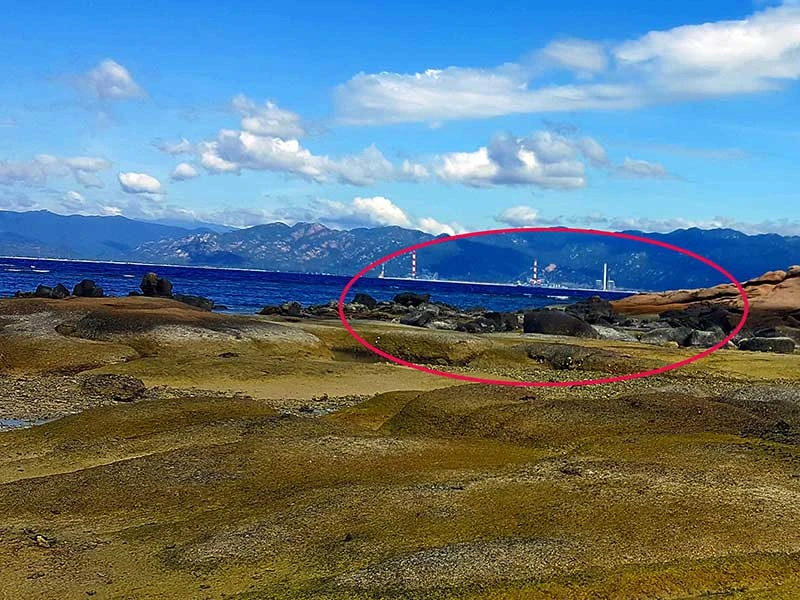 Một góc đảo Hòn Cau (rộng 140 ha) tuyệt đẹp, xa xa là ống khói của các nhà máy nhiệt điện Vĩnh Tân. Ảnh: PHƯƠNG NAM