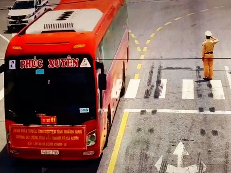 Hình ảnh Trung úy Tống Ngọc Kiên (Đội CSGT huyện Yên Dũng, Bắc Giang) không kìm nén được xúc động nên đã đứng ra chào đoàn công tác của 200 cán bộ, y, bác sĩ tỉnh Quảng Ninh tình nguyện lao vào tâm dịch như Bắc Giang để hỗ trợ công tác chữa trị bệnh nhân nhiễm COVID-19.