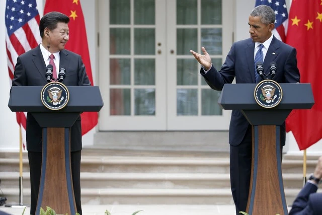 Ông Tập Cận Bình (trái) và Tổng thống Mỹ Barack Obama (phải) trong cuộc họp báo tại Vườn Hồng, Nhà Trắng (Mỹ) ngày 25-9-2015. Ảnh: WALL STREET JOURNAL