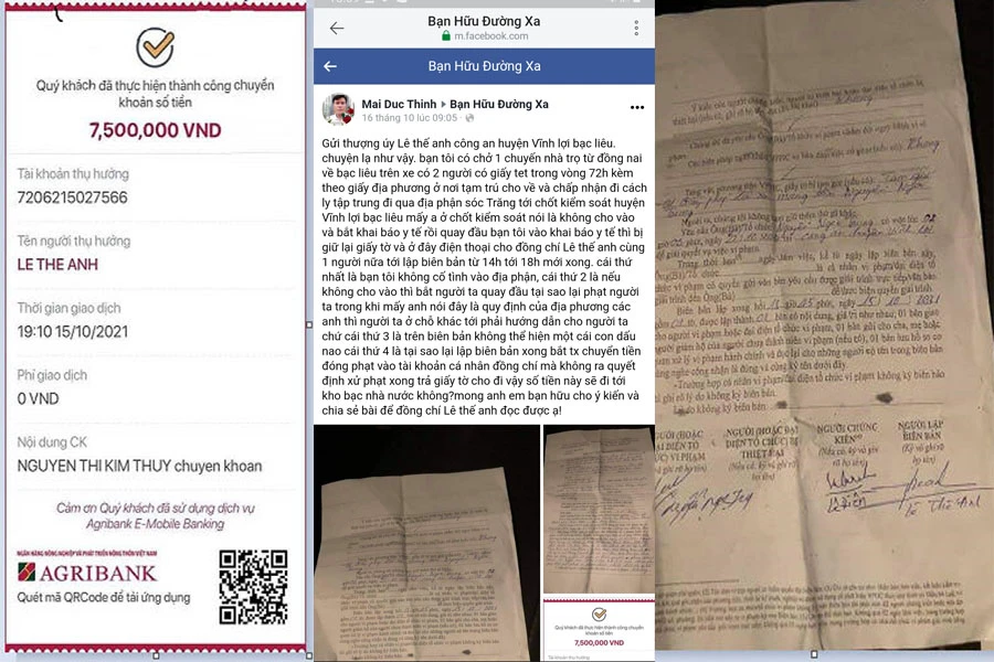 Các hình ảnh đăng trên Bạn Hữu Đường xa cho thấy có biên bản vi phạm, có xác nhận đã chuyển tiền 7,5 triệu đồng. Người bị lập biên bản vi phạm là tài xế Nguyễn Ngọc Trung, người ghi biên bản là L.T.A , thượng úy. Tài khoản được chuyển tiền mang cùng tên với thượng úy này.
