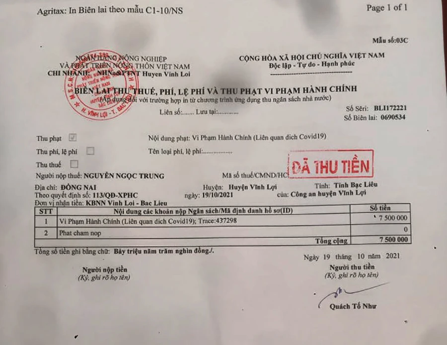 Phiếu thu tiền thể hiện cùng ngày 19-10-2021, do Ngân hàng Agribank Chi nhánh Vĩnh Lợi phát hành. Phiếu này thu của anh Nguyễn Ngọc Trung, ở Đồng Nai, số tiền 7,5 triệu đồng. Người thu có ký tên, nhưng chỗ ký tên của người nộp tiền bị bỏ trống.