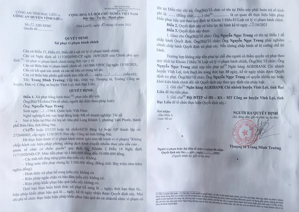 Các giấy tờ này thể hiện Trưởng công an huyện Vĩnh Lợi, Thượng tá Trang Minh Trường ký Quyết định phạt hành chính tài xế Trung 7,5 triệu đồng vào ngày 19-10-2021. Hành vi xử phạt tại Quyết định là vi phạm khoản 2, điều 14, Nghị định 117/2020/NĐ-CP, về "không chấp hành các biện pháp phòng chống dịch...".