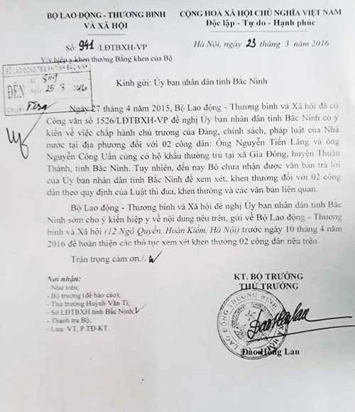 Theo đó, liên hệ với ông Nguyễn Tiến Nhường, Phó Chủ tịch Thường trực UBND, Chủ tịch Hội đồng Thi đua-Khen thưởng tỉnh Bắc Ninh, vị này cho biết cá nhân chưa nhận được công văn nào của Bộ LĐ-TB&XH, đồng thời đề nghị PV muốn tìm hiểu sự việc thì liên hệ với Sở Nội vụ tỉnh Bắc Ninh.