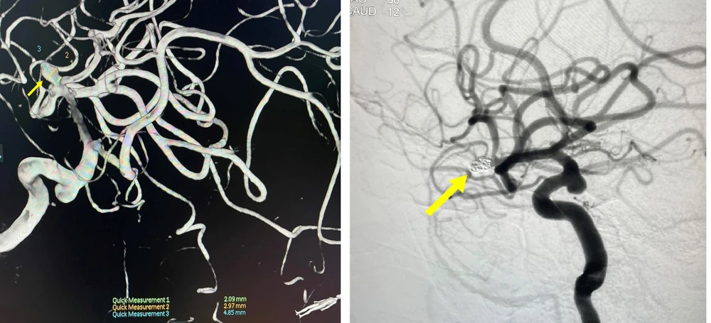 Túi phình động mạch não giữa trước (bên trái) và sau khi được tắt bằng cuộn kim loại. Ảnh: BVCC
