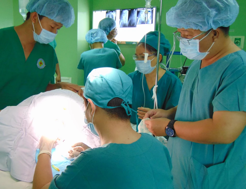 Bác sĩ BV quận 11, TP.HCM đang thực hiện ca thay khớp háng. Ảnh: TRẦN NGỌC |