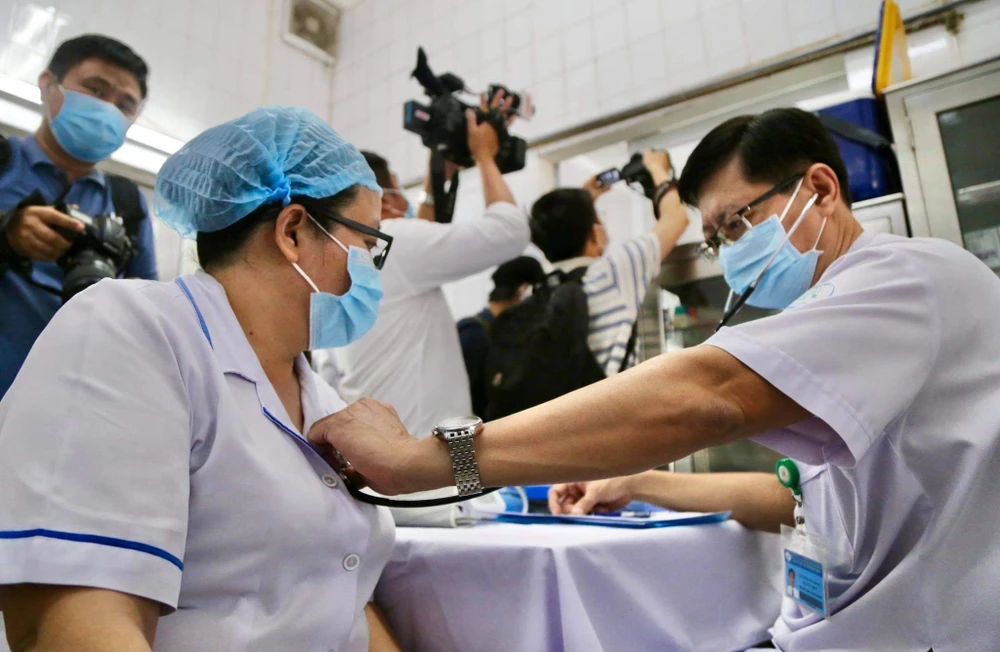 Trước khi tiêm vaccine COVID-19, các nhân viên y tế Bệnh viện Bệnh Nhiệt đới TP.HCM đều được khám sàng lọc sức khỏe. Ảnh: HUỲNH TRƯỜNG GIANG