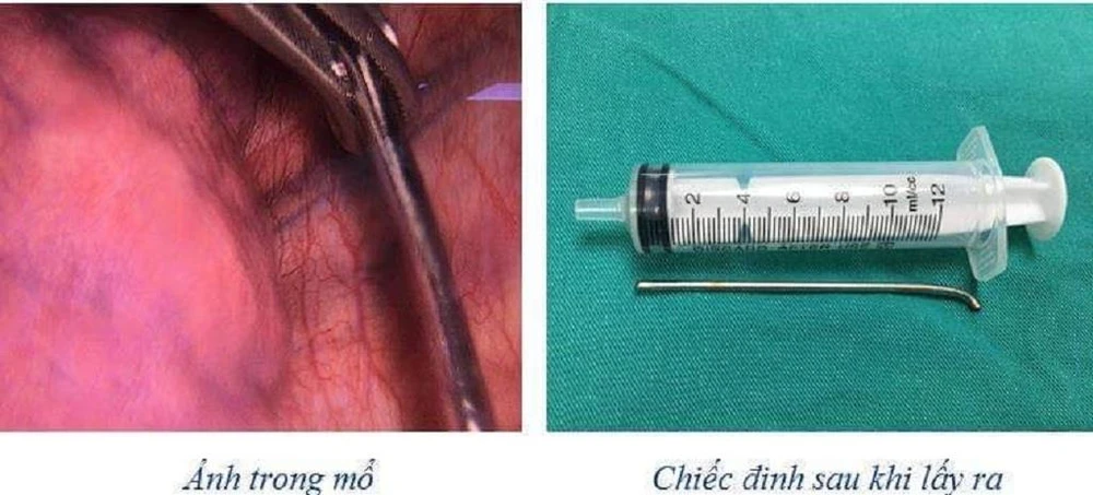 "Nguyên nhân là do chiếc đinh đó di chuyển từ vị trí xương đòn trái theo thời gian nó rơi tự do vào trong khoang màng phổi trái. Trước khi mổ ca bệnh này thì kíp phẫu thuật và kíp gây mê hồi sức đã chuẩn bị tối đa các phương án đề phòng nếu có tổn thương hệ thống mạch máu lớn và tim. Rất may mắn là chiếc đinh chỉ làm rách nhu mô phổi gây tràn khí khoang màng phổi trái", bác sĩ Phương giải thích.