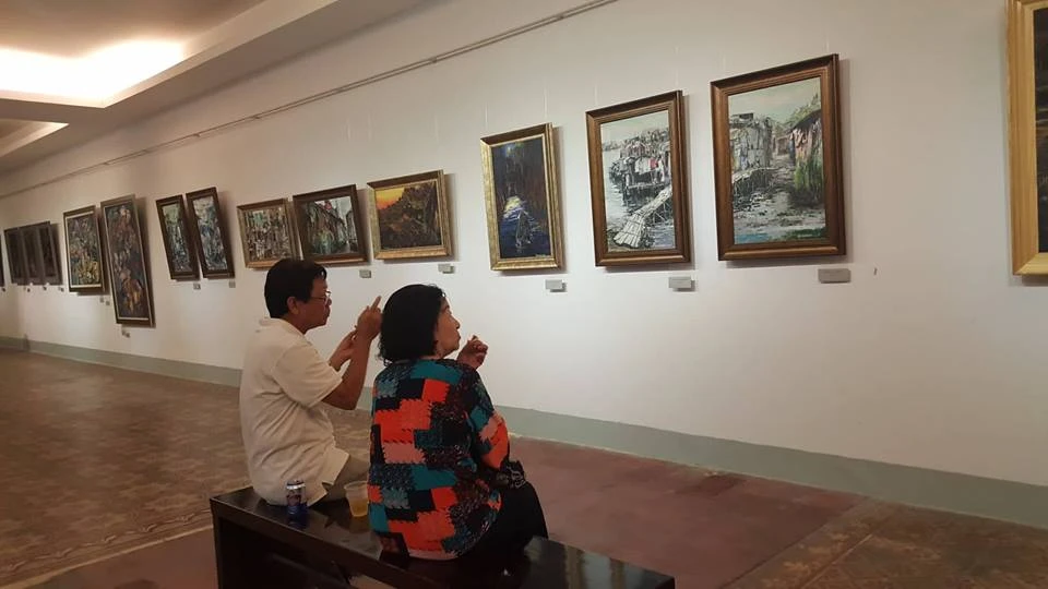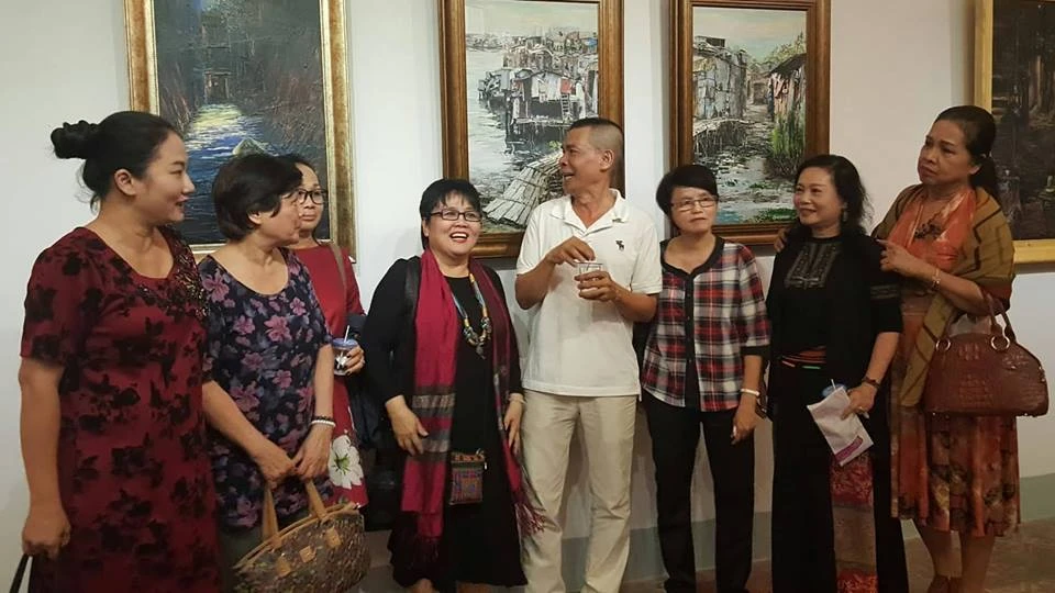 Họa sĩ Mai Nam (áo trắng) cùng những người đến xem triển lãm