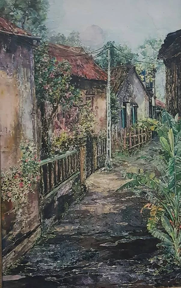 Con hẻm loang lổ, có quảng cáo khoan cắt bê tông cũng nên thơ trong tranh xé giấy dán.