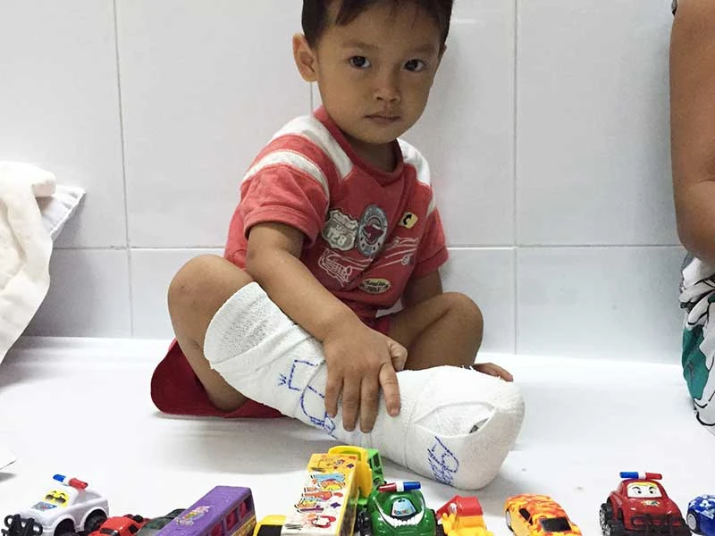 Ngày 25-4, bé Khang được đưa lên TP.HCM. Kết quả chẩn đoán cho thấy bé bị co rút mặt lưng bàn chân phải và vùi lấp các ngón chân khiến bé đi cà nhắc và không thể mang giày.