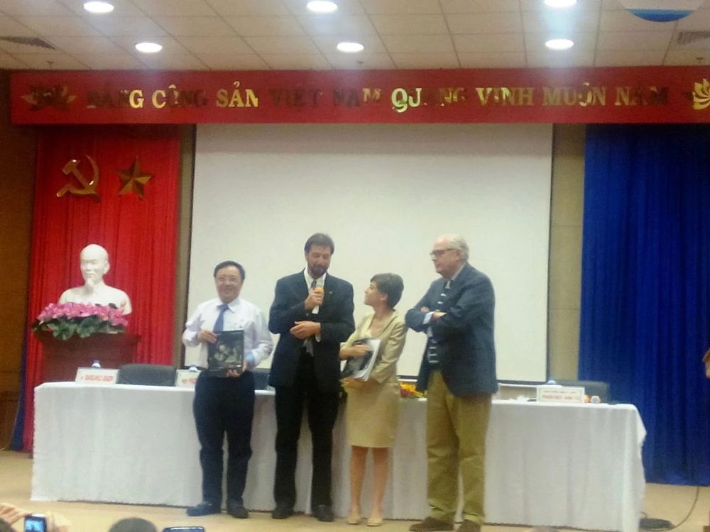 Đại diện của Hiệp hội Interplast Intherenos Italy tặng quà lưu niệm cho Tổng Lãnh sự quán Italia tại TP.HCM và lãnh đạo BV Đồng Nai. Ảnh: TIẾN DŨNG