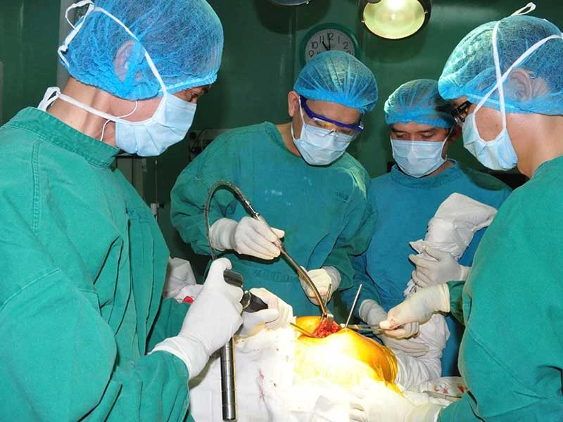 TS-BS Nguyễn Đình Phú (bên trái) trong một ca mổ thay khớp háng. Ảnh: DUY TÍNH