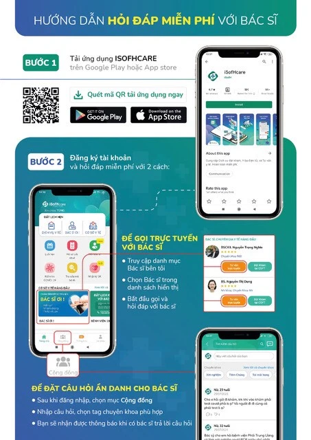 Để tham gia chương trình và nhận tư vấn trực tiếp từ các bác sĩ, người dùng chỉ cần tải, cài đặt và đăng nhập ứng dụng đặt khám thông minh của ISOFHCARE. Sau đó, truy cập vào chuyên mục chương trình Bác sĩ ơi!, rồi chọn bác sĩ có chuyên khoa cần tư vấn.
