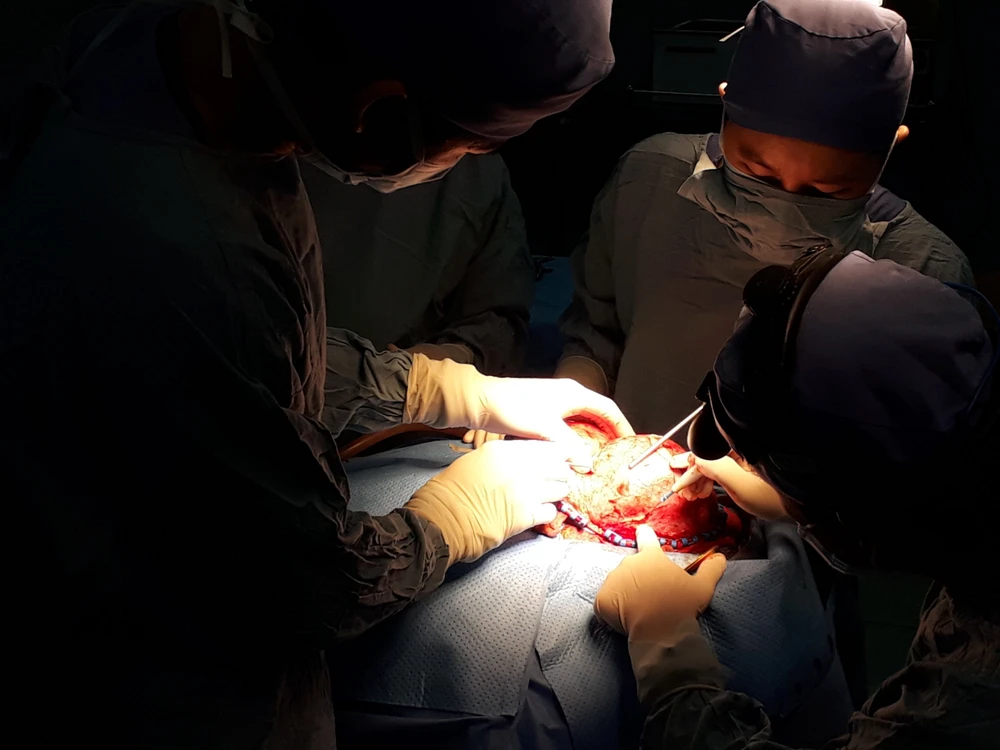 BS Cần cùng êkíp phẫu thuật đang tạo hình hộp sọ cho bệnh nhi. Ảnh: HL