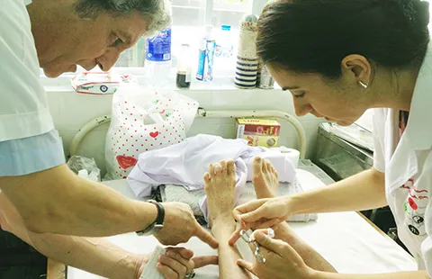Tại một phòng bệnh khoa Nội 1 của Viện Y dược học dân tộc TP.HCM, bốn bác sĩ (BS) Tây mặc áo blouse đang chụm đầu xì xào xì xồ và ghi ghi chép chép. Rồi một người đến cạnh giường bệnh nhân Ngô Thị Lan (70 tuổi, quận Tân Bình) dùng tay bắt mạch và bấm huyệt từ đầu xuống cổ, lưng, bụng, chân tay. Cứ sau mỗi lần bấm, “ông Tây” đều hỏi một câu bằng tiếng Việt “Đau không?”.