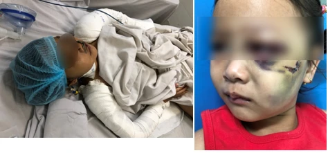 Hai bệnh nhi bị chấn thương hàm mặt gãy tay chân và gãy gò má, ổ xương mắt, vỡ xoang hàm, gãy xương hàm trên bên trái. Ảnh: BSCC