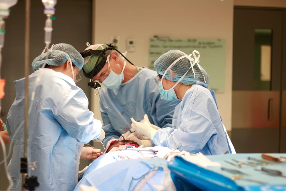 Bác sĩ McKay McKinnon và ekip bác sĩ BV FV đang phẫu thuật cho bé Trương Thiện Nhân. Ảnh: NU