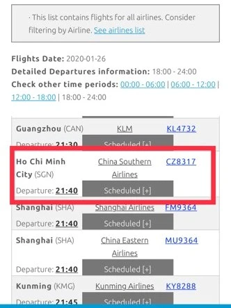 Ngày 26-1, một số trang thông tin vẫn cập nhật những chuyến bay đi/đến TP Vũ Hán, tỉnh Hồ Bắc (Trung Quốc). Đặc biệt, trong đó có chuyến bay CZ8317 của hãng hàng không China Southern Airlines từ Vũ Hán đến Tân Sơn Nhất lúc 21 giờ 40 cùng ngày. Thông tin này lập tức được chia sẻ trên các trang mạng xã hội, gây lo lắng cho người dân.
