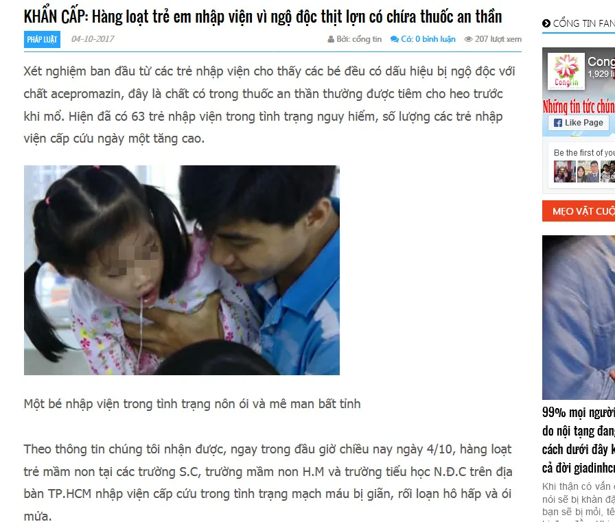 Trước đó, ngày 4-10, một số trang mạng đăng tải bài viết “Khẩn cấp: Hàng loạt trẻ em nhập viện vì ngộ độc thịt lợn có chứa thuốc an thần” với nội dung: “Xét nghiệm ban đầu từ các trẻ nhập viện cho thấy các bé đều có dấu hiệu bị ngộ độc với chất acepromazin, đây là chất có trong thuốc an thần thường được tiêm cho heo trước khi mổ. Hiện đã có 63 trẻ nhập viện trong tình trạng nguy hiểm, số lượng các trẻ nhập viện cấp cứu ngày một tăng cao”.