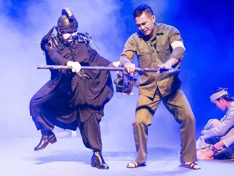 Nghệ sĩ Bạch Long hiện nay bằng lòng với cuộc sống còn nhiều bấp bênh và nghĩ đến… cái chết của mình.Trong ảnh: Bạch Long (trái) vai Thần Chết trong vở kịch Giấc mơ.