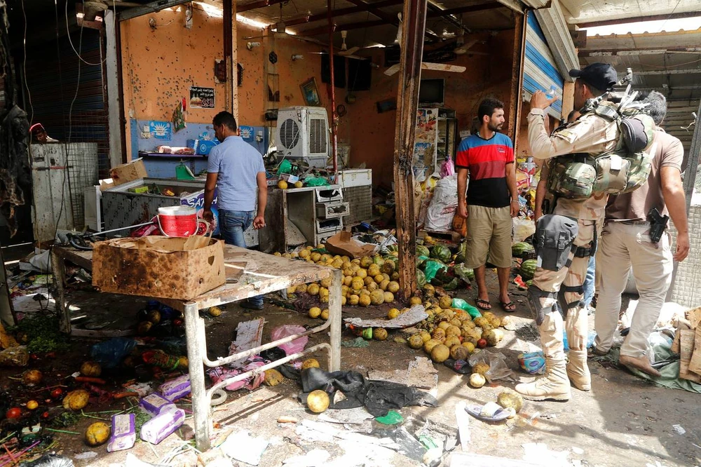 Cảnh sát kiểm tra hiện trường vụ đánh bom một khu chợ ở Baghdad ngày 17-5. (Ảnh: REUTERS)