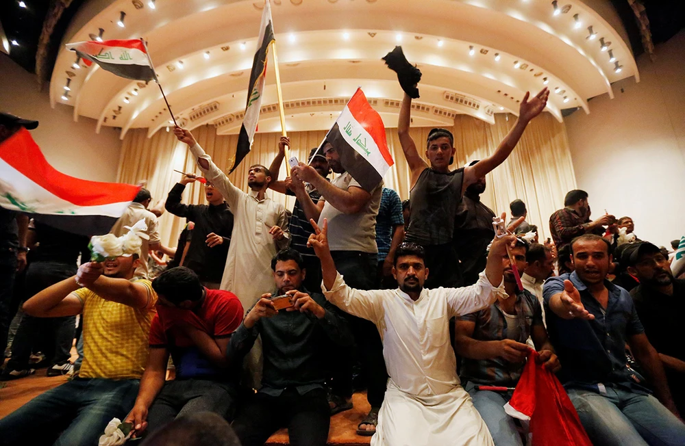 Hàng ngàn người ủng hộ giáo sĩ Moqtada al-Sadr xông vào tòa nhà Quốc hội Iraq ngày 30-4 để phản đối chính phủ. (Ảnh: REUTERS)