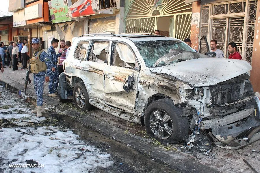 Một chiếc xe bị sức nổ của quả bom làm cho bẹp dúm. Ảnh: Xinhua