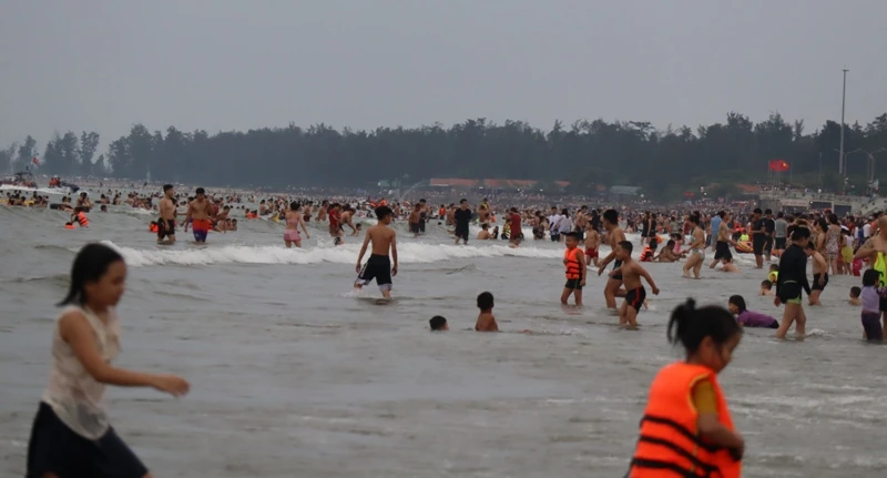Tại bãi tắm chính của biển Cửa Lò hàng ngàn du khách tắm biển và vui chơi. Bãi tắm dài hơn 3 km chật kín người.