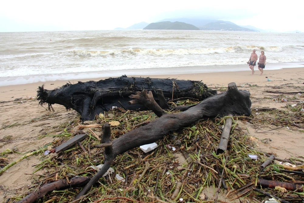 Có đủ các loại rác chất thành đống như cành cây, rong, dừa khô... Nhiều đồ dùng của người dân cũng theo nước lũ đổ ra biển, rồi bị sóng đánh dạt vào bờ.