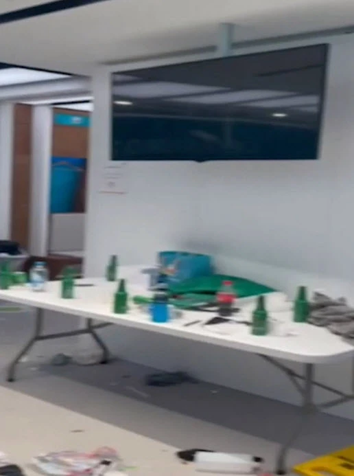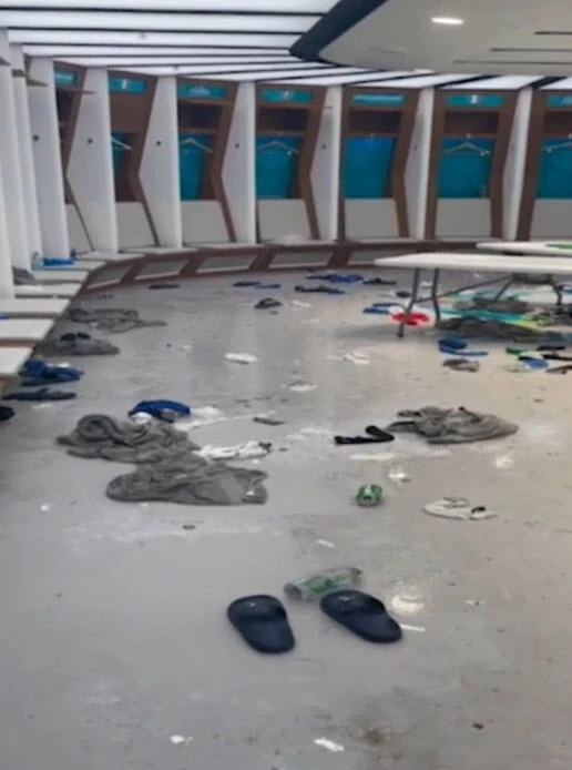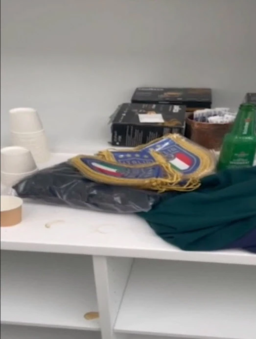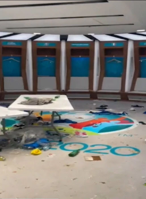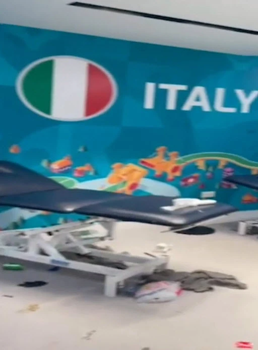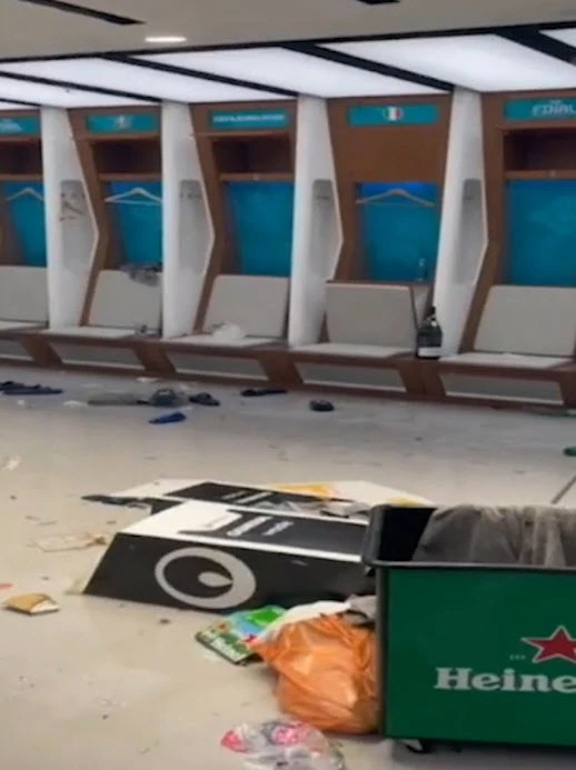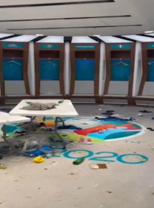 Hình ảnh được ghi lại cho thấy, phòng thay đồ của tuyển Ý sau trận chung kết Euro 2020 chẳng khác nào bãi rác với hàng đống vật dụng như khăn, giày, dép, tất, quần đùi… vứt vương vãi trên sàn nhà. Những chai bia và sâm banh bị vứt bỏ khắp nơi.
